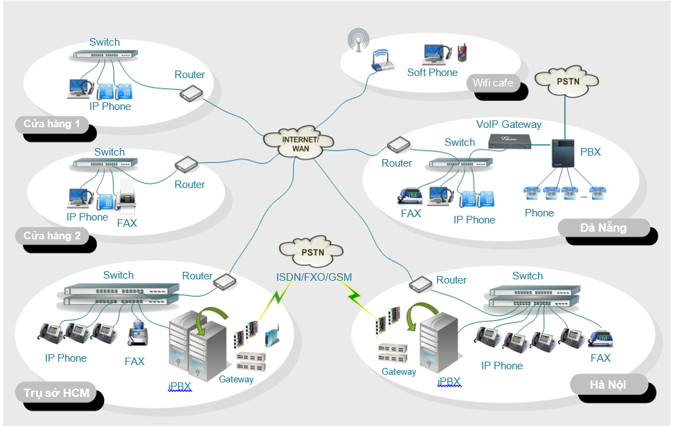 | 4 | Đà Nẵng gọi HCM | Nhấc máy nhánh analog của tổng đài PBX truyền thống ấn số 8 (giả sử số 8 đã được khai báo trên PBX truyền thống gọi đi hướng VoIP Gateway) + số máy nhánh hội sở hoặc chi nhánh muốn gặp. | |