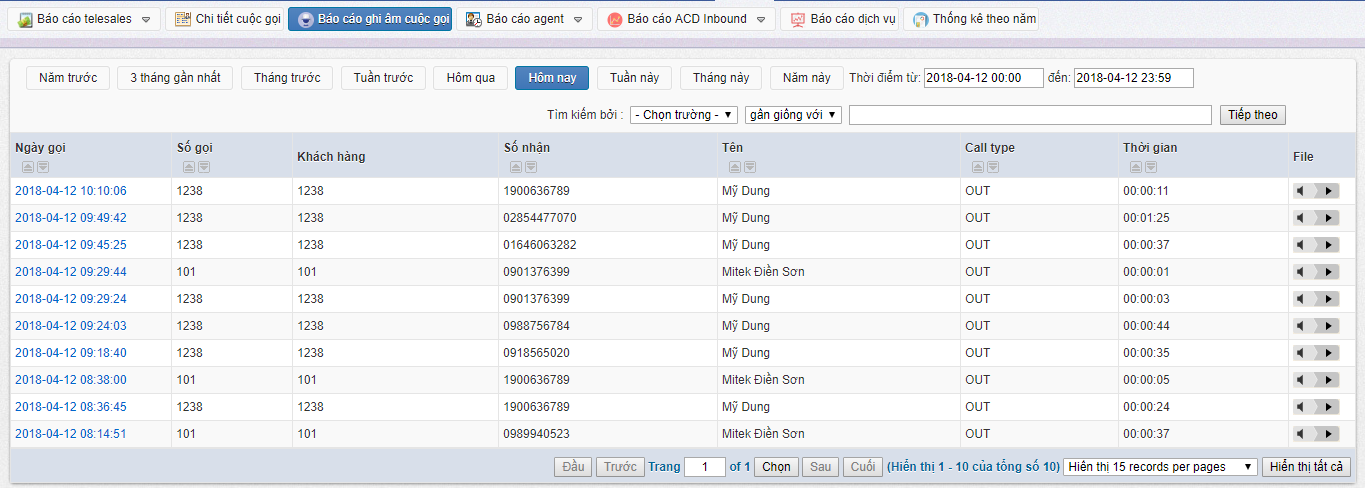 Tìm kiếm theo: Ngày giờ cuộc gọi, Tên ĐTV, Số đã gọi, hướng gọi, …. .