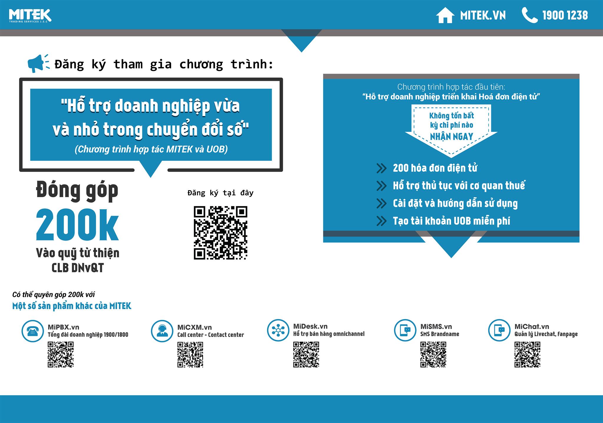 Cũng tại sự kiện này, MITEK sẽ lần đầu tiên ra mắt chương trình “Hỗ trợ doanh nghiệp vừa và nhỏ Việt Nam trong chuyển đổi số” của MITEK (với sự hỗ trợ và hợp tác của Ngân hàng UOB). Cụ thể đó là triển khai Hoá đơn điện tử MiTAX HOÀN TOÀN MIỄN PHÍ cho doanh nghiệp tham gia sự kiện