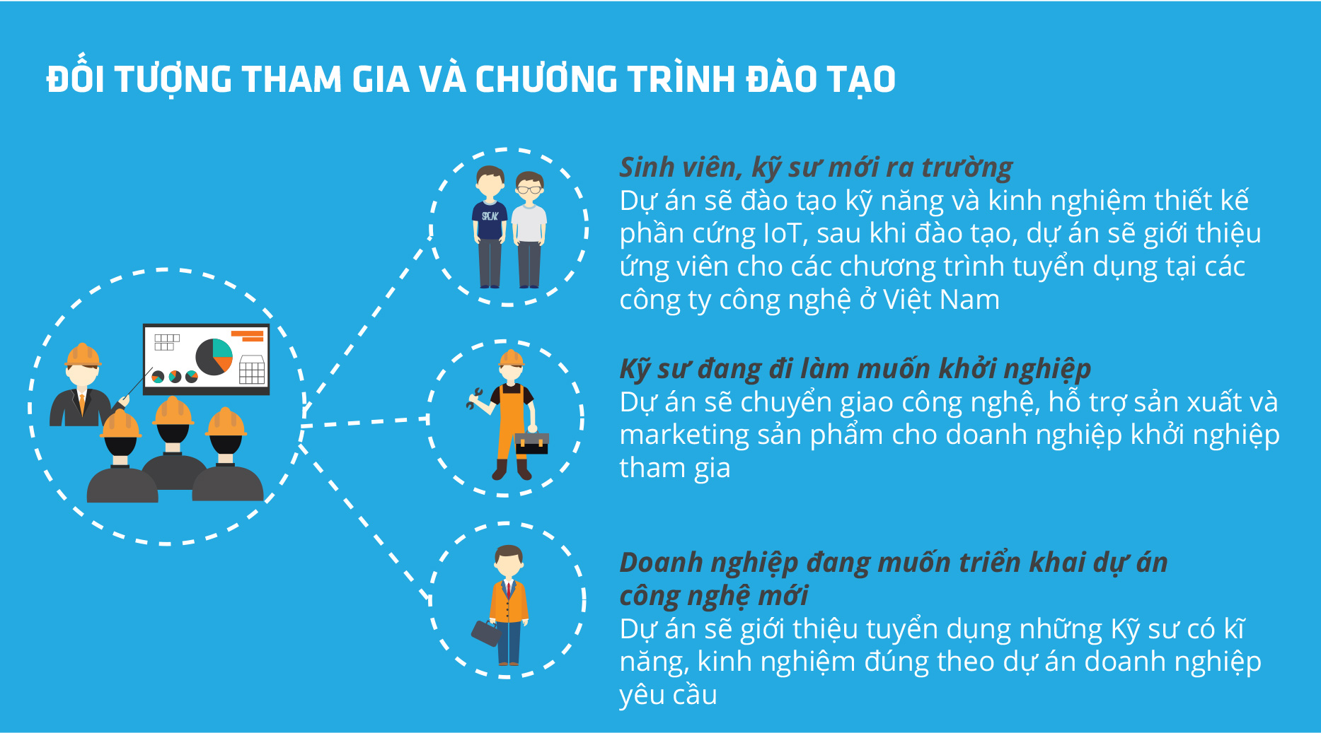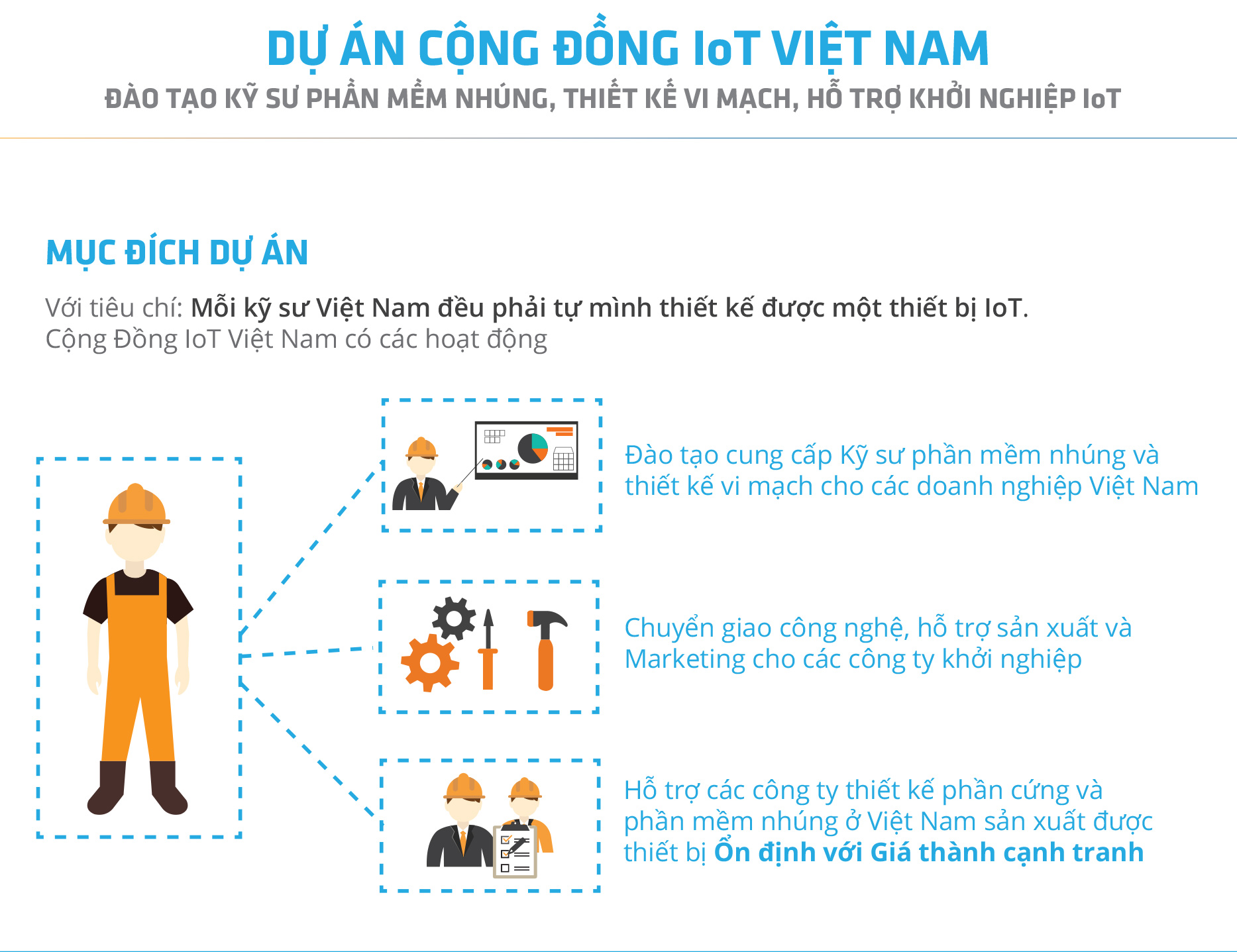 Bạn là người đam mê công nghệ, bạn muốn tạo ra sản phẩm ứng dụng công nghệ, kĩ thuật để giải quyết các vấn đề trong cuộc sống, hoặc bạn đang muốn tạo ra một sản phẩm phần cứng có thể giải quyết vấn đề ngay trong gia đình bạn? Thậm chí, có thể bạn không phải là dân kĩ thuật, bạn không biết gì về điện trở hay tụ điện,…? Nếu bạn thực sự có đam mê và muốn tạo ra sản phẩm có ích, bạn có thể tham gia Dự án Cộng đồng IoT do ông David Triệu thực hiện. Tham gia dự án, các bạn sẽ được đào tạo miễn phí vì tiêu chí hoạt động của dự án là: Mỗi kỹ sư Việt Nam đều phải tự mình thiết kế được một thiết bị IoT.