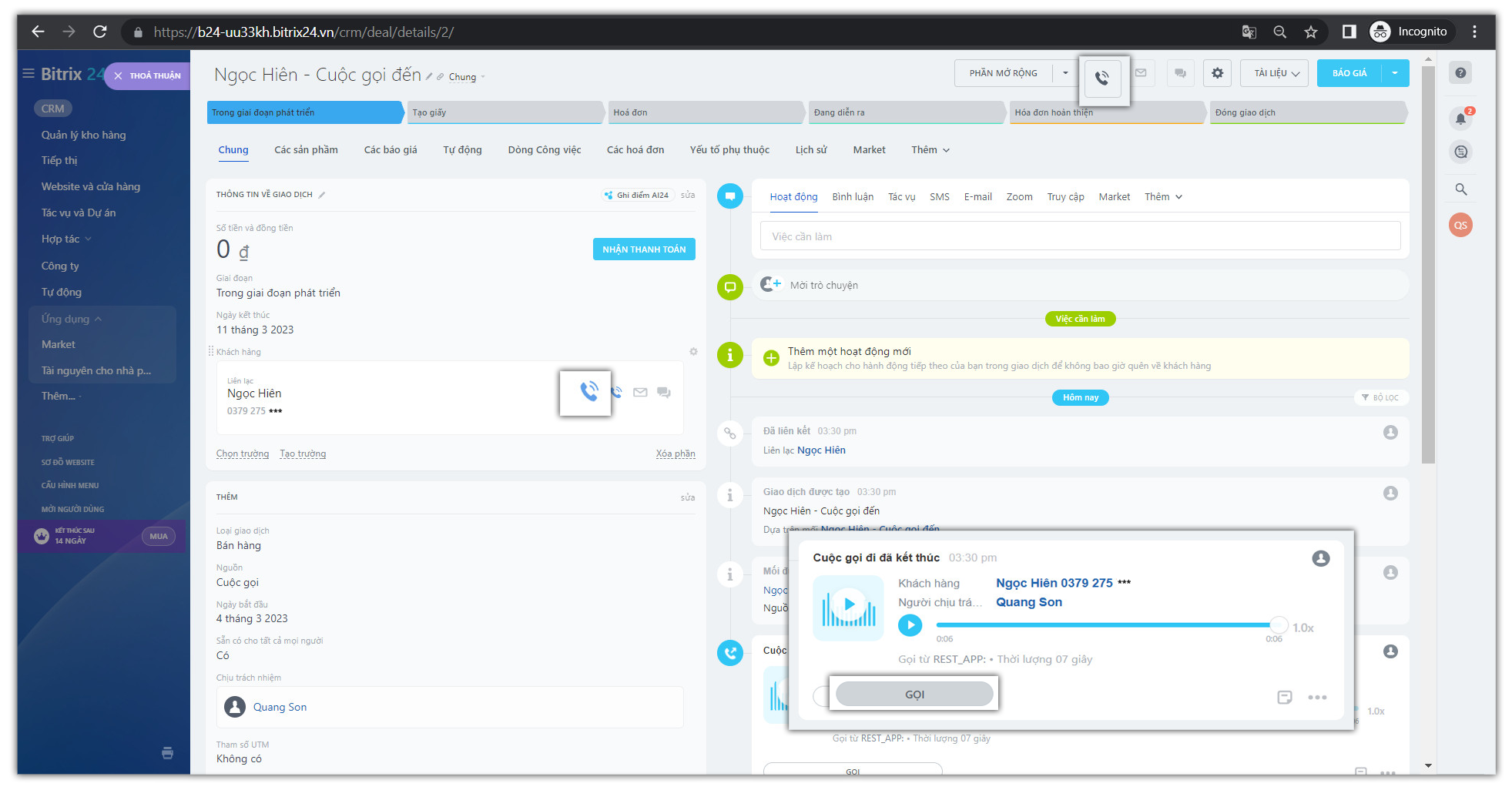 4. Quản lý lịch sử tương tác cuộc gọi vào ra trong hệ thống Bitrix24