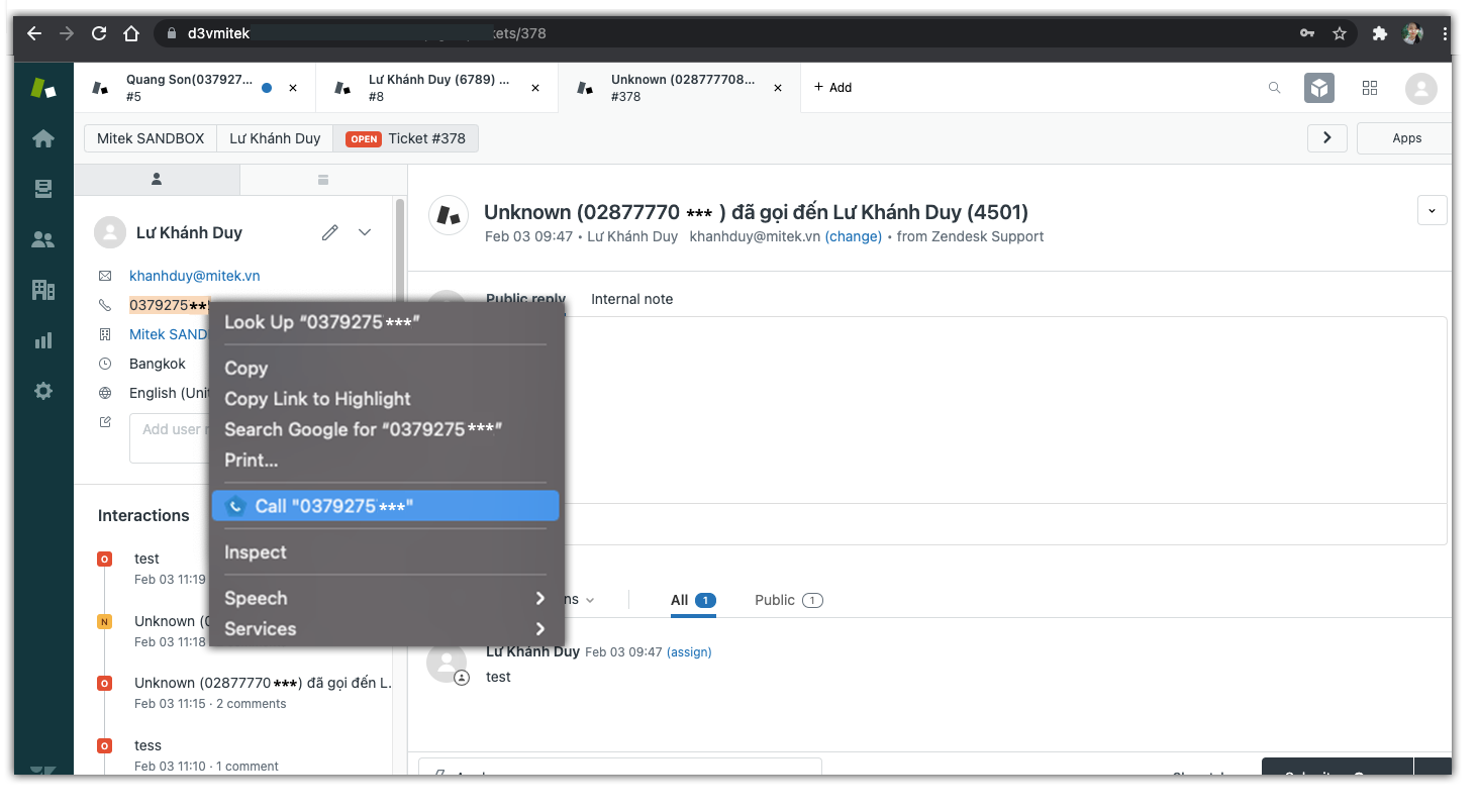 3. Thao tác Click to Call trực tiếp trên Zendesk
