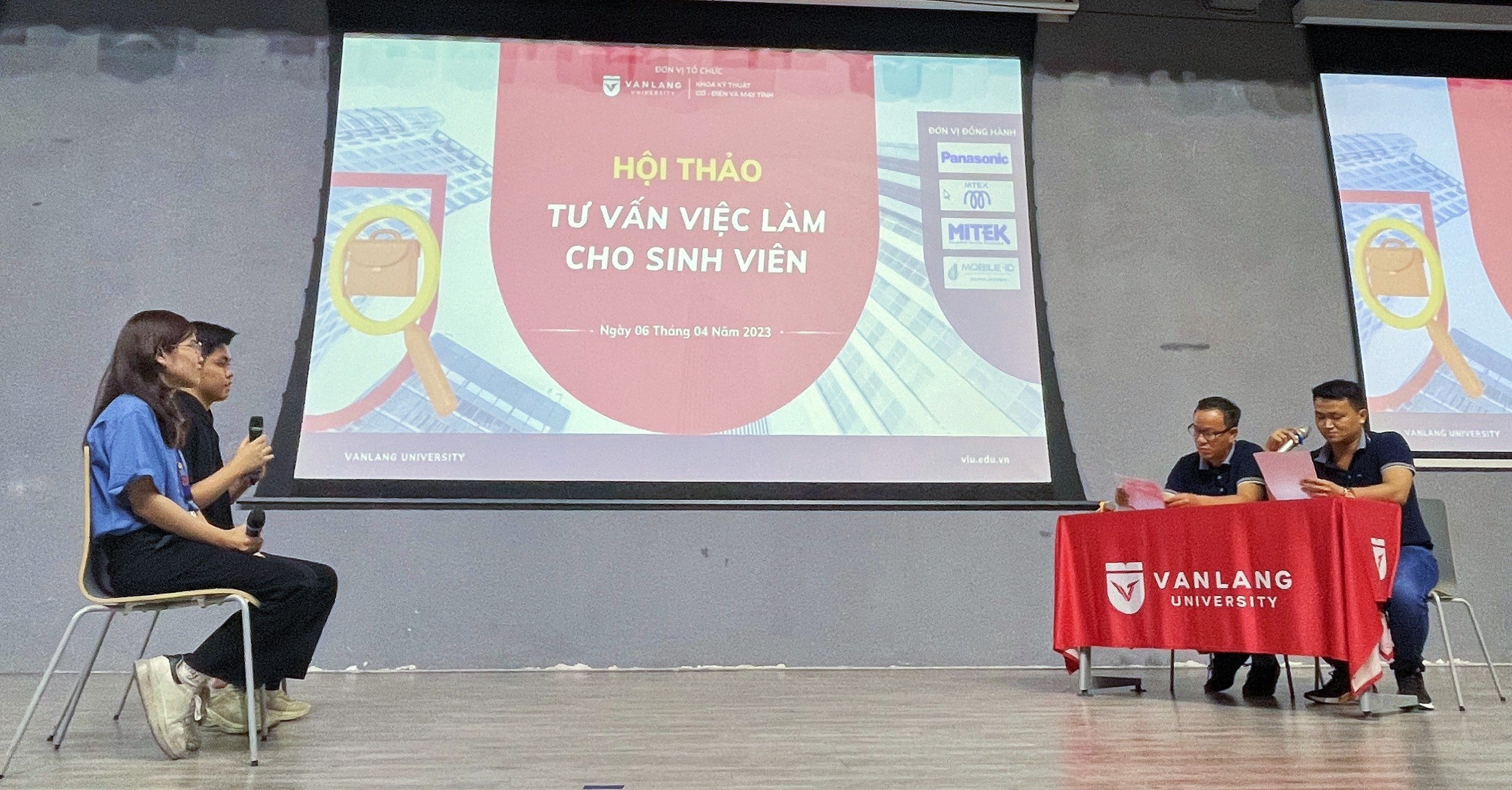 Chiều ngày 06/04/2023, Khoa Kỹ thuật Cơ – Điện và Máy tính của Trường Đại học Văn Lang phối hợp cùng doanh nghiệp tổ chức buổi hội thảo với chủ đề: “Tư vấn việc làm cho sinh viên” nhằm tạo điều kiện cho sinh viên được trao đổi về nghề nghiệp, cơ hội việc làm ứng tuyển các doanh nghiệp. Hội thảo có sự tham gia của các doanh nghiệp từ Panasonic, MITEK, Mobile ID và MTEX cùng các Thầy Cô đang công tác tại Khoa Kỹ thuật Cơ điện và Máy tính và các bạn khoa Kỹ thuật – Cơ – Điện và Máy tính.