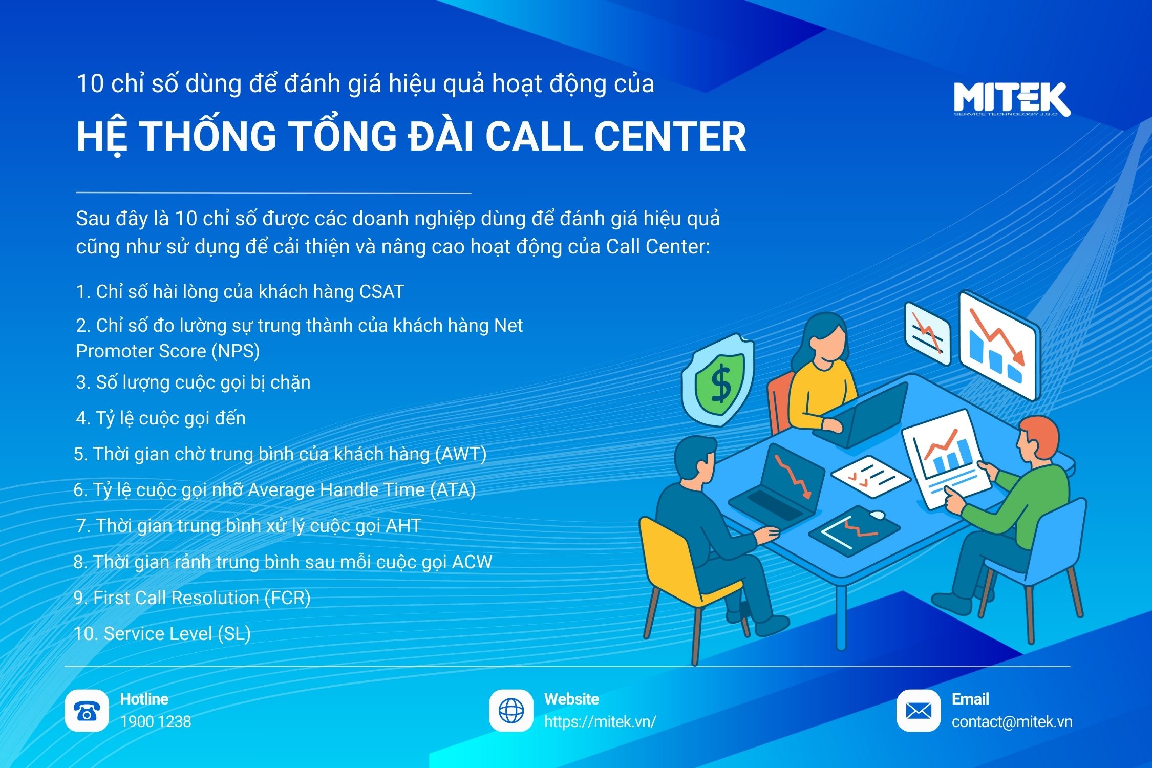 Sau đây là 10 chỉ số được các Doanh nghiệp dùng để đánh giá hiệu quả cũng như sử dụng để cải thiện và nâng cao hoạt động của Call Center:
