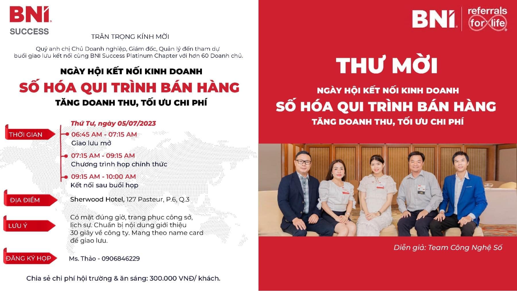 Vào ngày 05/07/2023 sắp tới đây, sự kiện Ngày hội Kết Nối Kinh Doanh Số Hóa Qui Trình Bán Hàng: Tăng Doanh Thu – Tối Ưu Chi Phí sẽ được BNI Success Chapter tổ chức tại TP HCM.