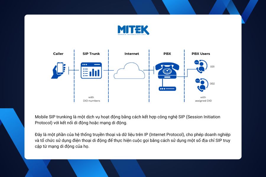 Mobile SIP trunking là một dịch vụ hoạt động bằng cách kết hợp công nghệ SIP (Session Initiation Protocol) với kết nối di động hoặc mạng di động.