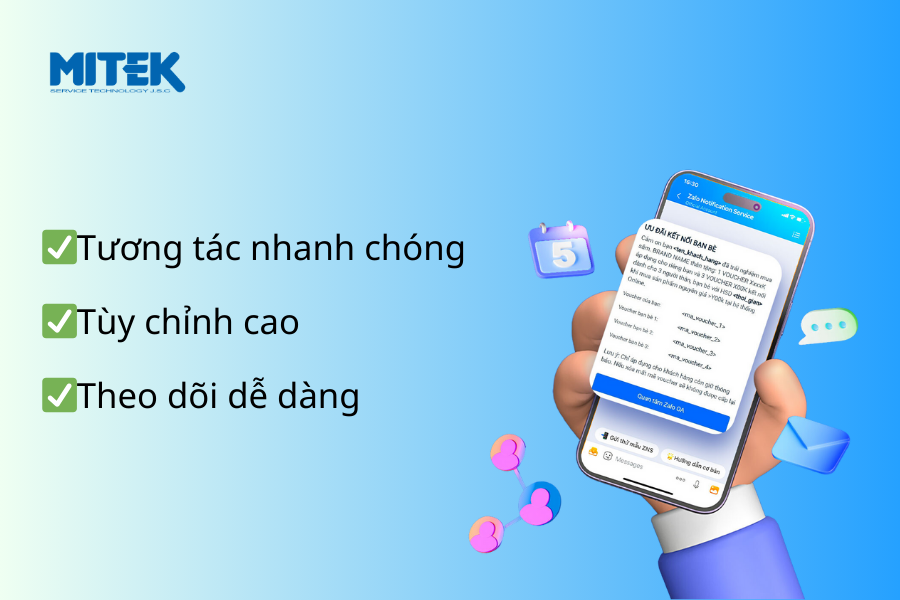Với ZBS Template Message, doanh nghiệp có thể gửi thông báo tức thì, tận dụng tính năng tương tác cao của Zalo để thúc đẩy sự gắn kết và phản hồi từ khách hàng.