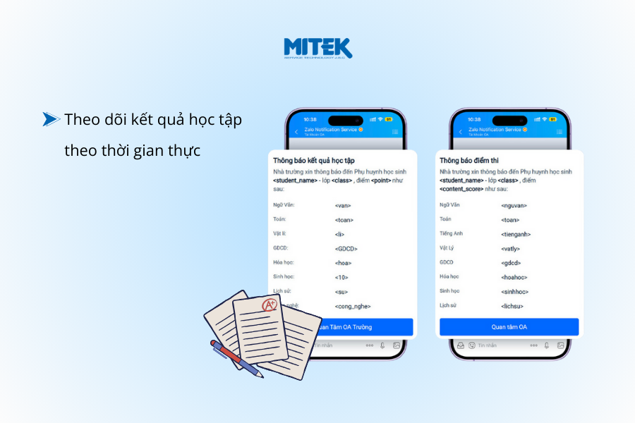 Thông báo ZBS Template Message cho phép nhà trường gửi thông báo kết quả học tập trực tiếp đến phụ huynh và học sinh.