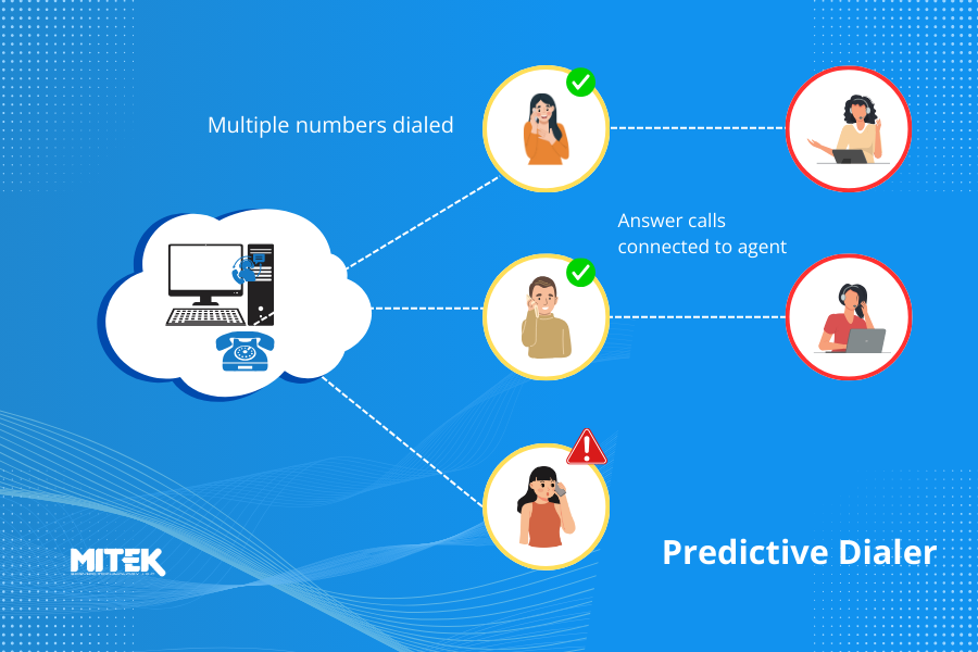 Predictive Dialer sẽ tự động gọi đến dãy số điện thoại và có thể giúp các nhân viên tổng đài lọc bớt các số bận, thư thoại, không trả lời và các số bị ngắt kết nối.