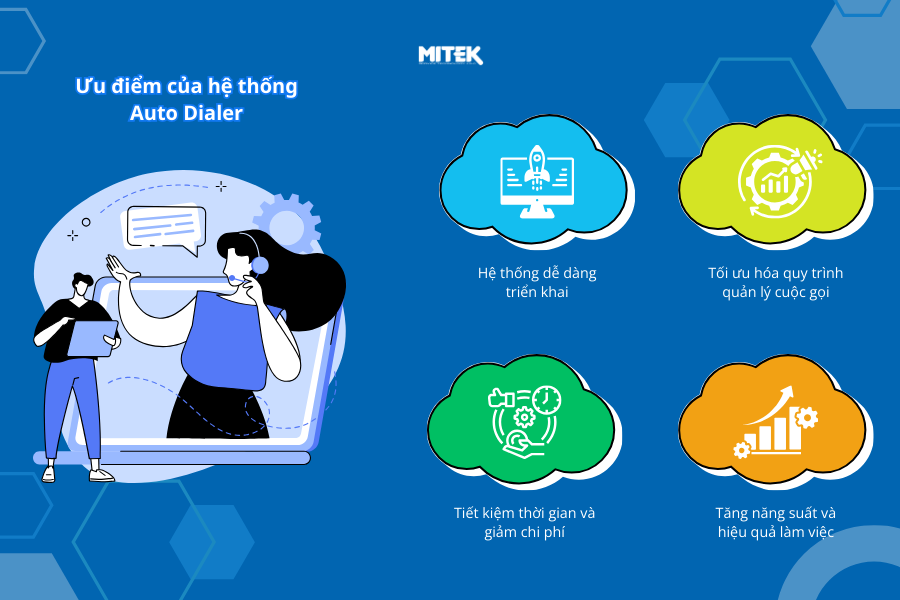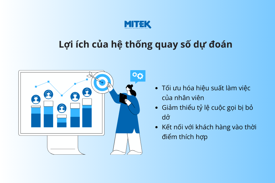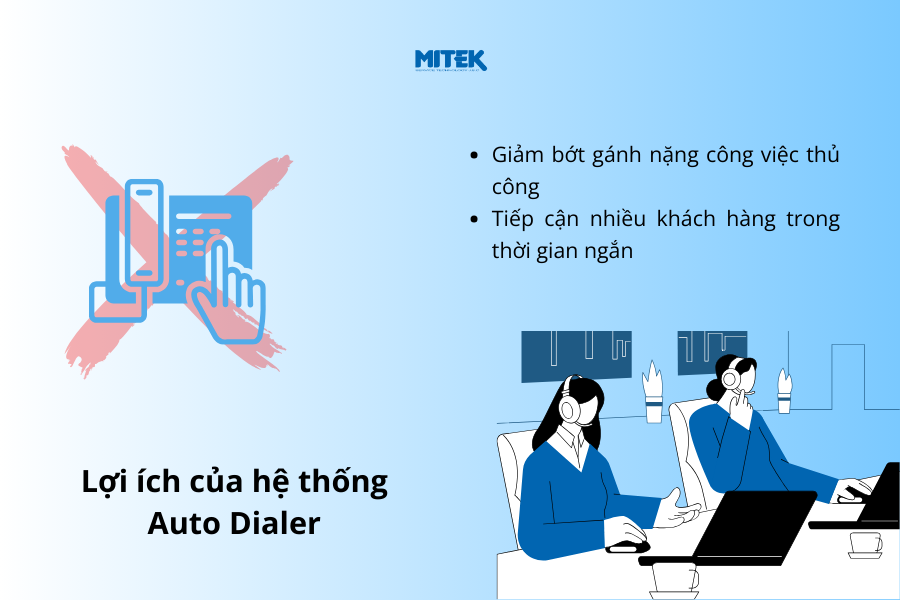 Hệ thống này giúp nhân viên loại bỏ việc quay số thủ công và mang lại nhiều tiện ích tuyệt vời, chẳng hạn như tăng năng suất và hiệu quả thực hiện hàng trăm hàng nghìn cuộc gọi.