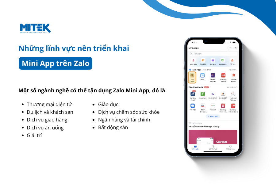 Zalo Mini App có thể phù hợp với nhiều ngành nghề và lĩnh vực khác nhau, đặc biệt là những lĩnh vực có nhu cầu tương tác cao với khách hàng và cung cấp dịch vụ trực tuyến.