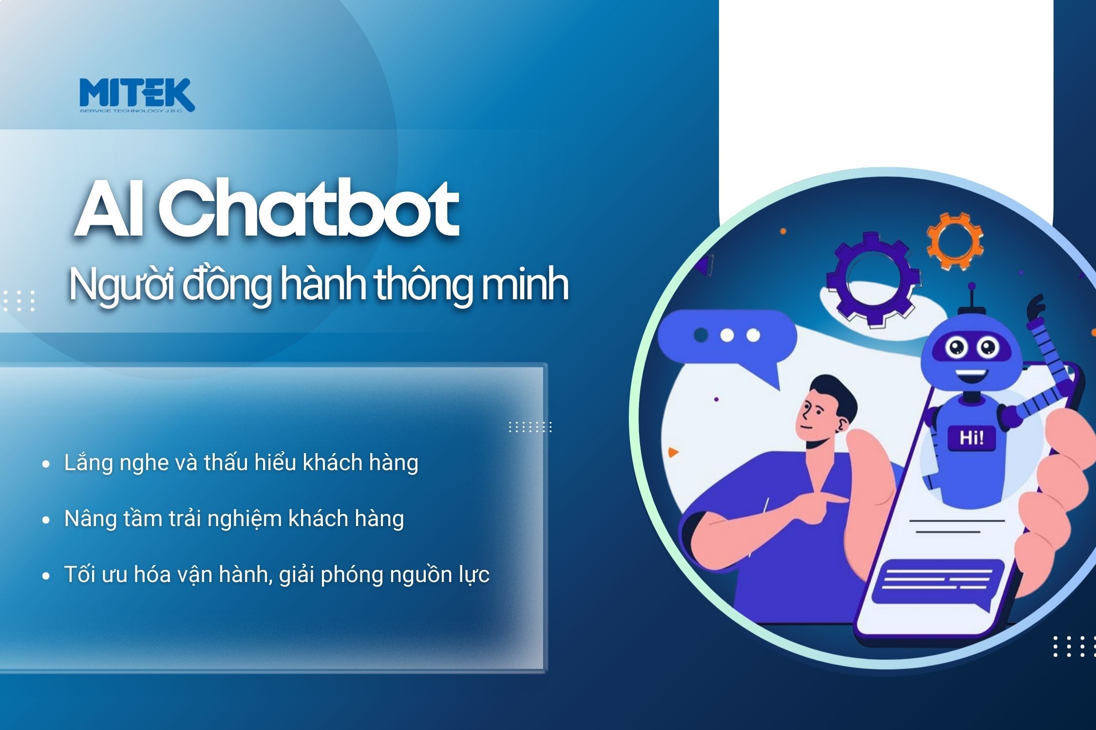 Và AI ChatBot của MITEK chính là một giải pháp cầu nối giữa công nghệ và cảm xúc, là bước tiến chiến lược giúp Doanh nghiệp dẫn đầu, tạo dựng niềm tin và bứt phá trong cạnh tranh.
