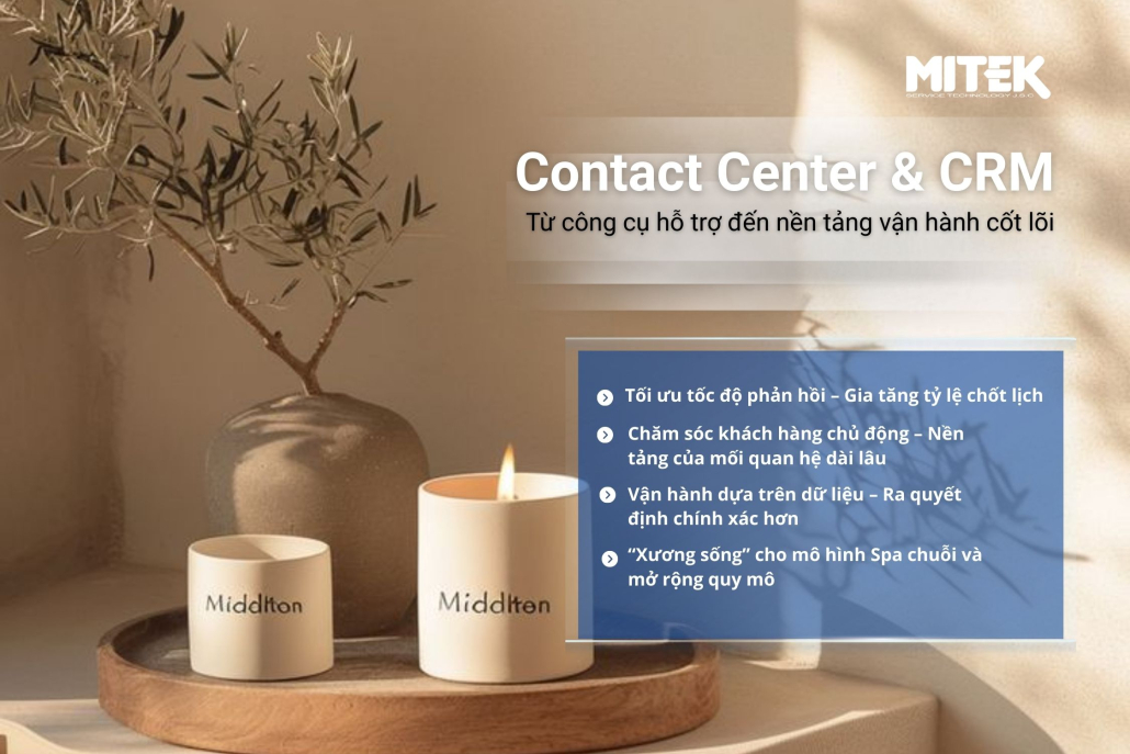 Với giải pháp CRM Contact Center của MITEK, Spa và Thẩm mỹ viện có thể từng bước nâng cấp trải nghiệm khách hàng, tối ưu vận hành và xây dựng nền tảng vững chắc cho tăng trưởng dài hạn.Trong một thị trường ngày càng cạnh tranh, đây không chỉ là câu chuyện công nghệ, mà là cách doanh nghiệp lựa chọn chăm sóc khách hàng của mình.