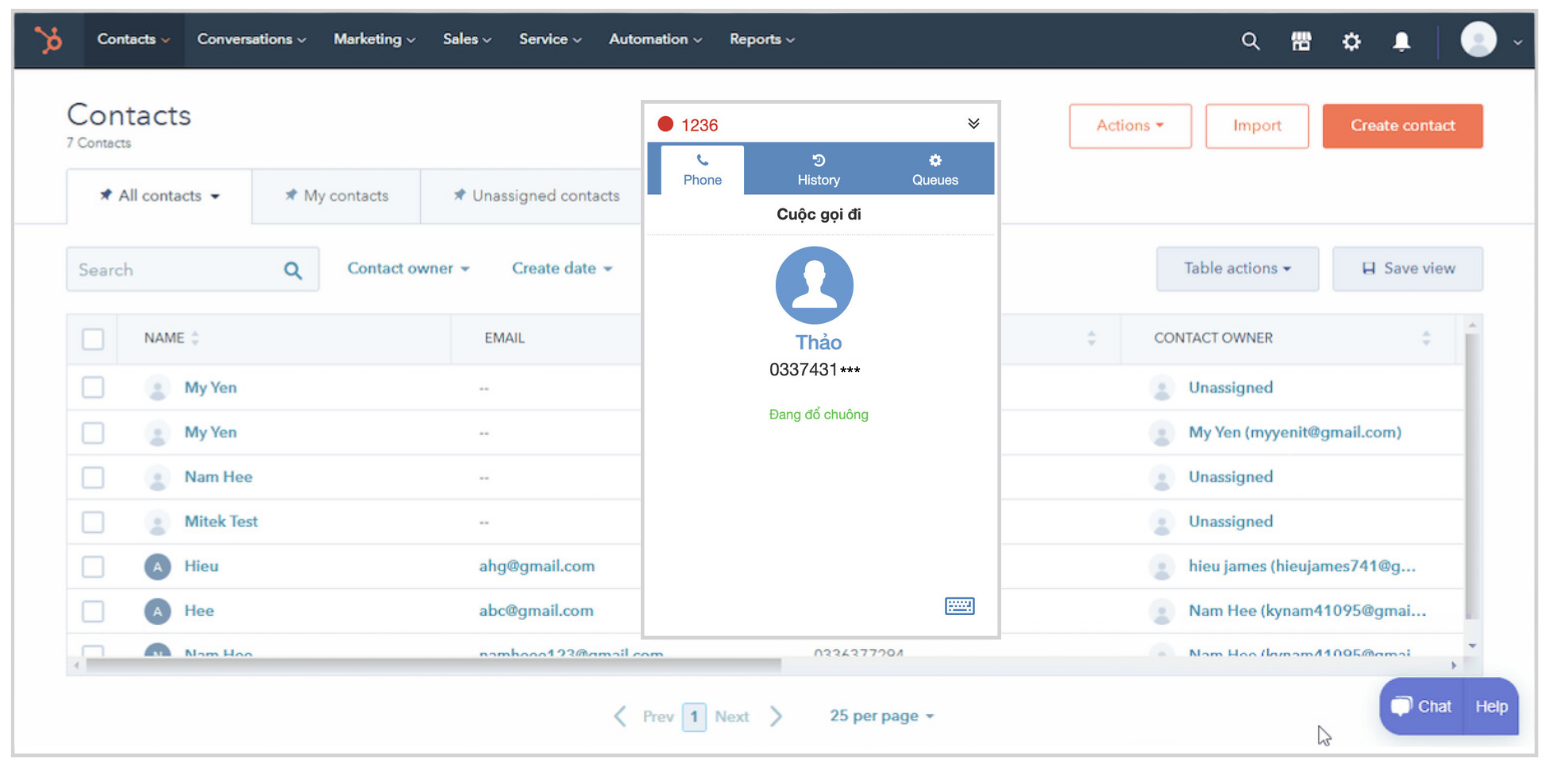 Dễ dàng và nhanh chóng thực hiện cuộc gọi chỉ với một cú Click chuột ngay trên màn hình HubSpot CRM.Thao tác chọn số và click call để thực hiện cuộc gọi ra cho khách hàng
