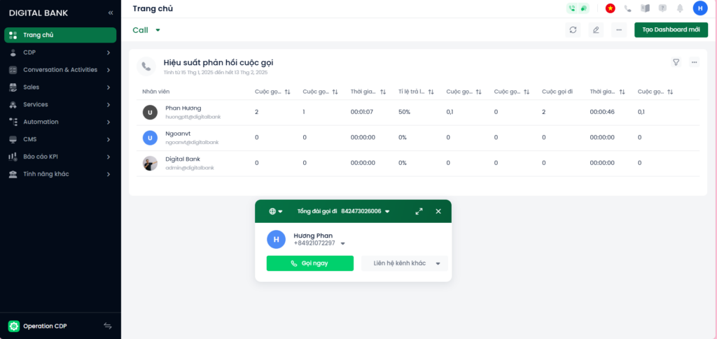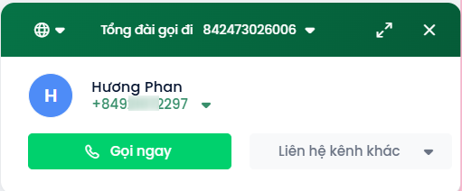 Bấm vào số điện thoại của khách hàng muốn liên hệ giao diện hiển thị cửa sổ đàm thoại với khách bấm Gọi ngay.