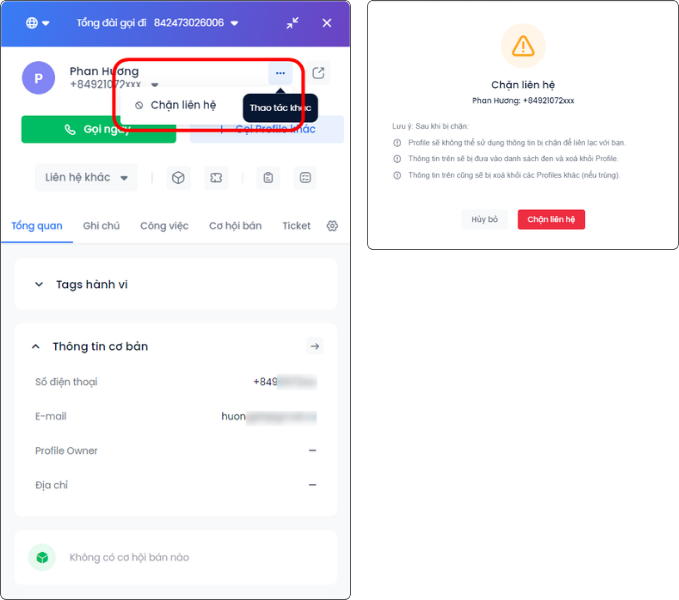 Người dùng có thể Chặn liên hệ để tránh bị spam tổng đài. Bấm Chặn liên hệ giao diện hiển thị cửa sổ thông báo các lưu ý.