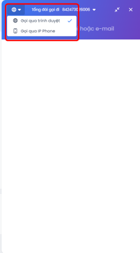 Người dùng có thể lựa chọn Gọi qua trình duyệt hoặc Gọi qua IP Phone (nếu đã tích hợp thiết bị này vào Mobio) trên pop up cuộc gọi.
