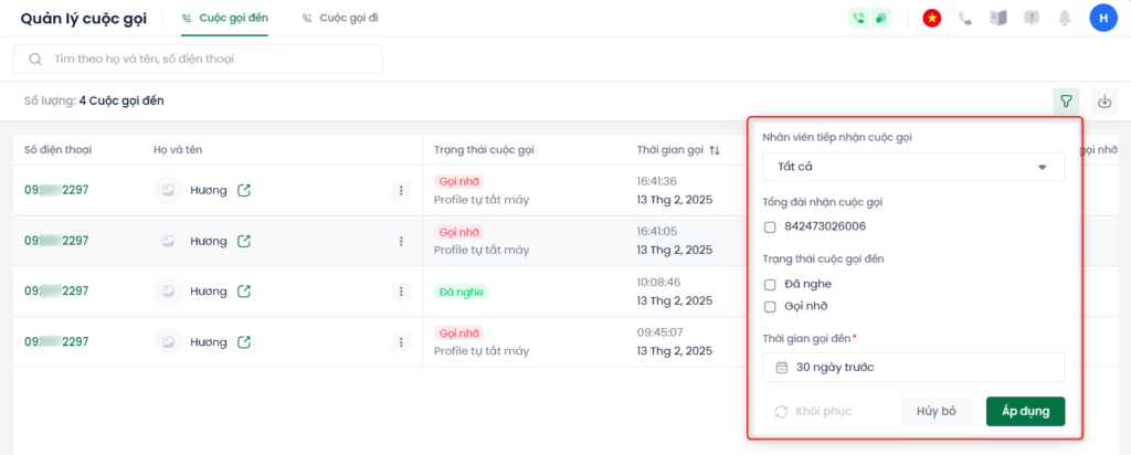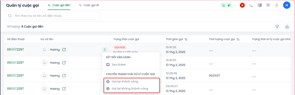 Chức năng này giúp người dùng quản lý cuộc gọi nhỡ, bao gồm 2 trạng thái: Gọi lại thành công và Gọi lại không thành công.