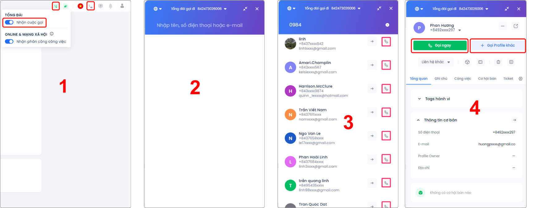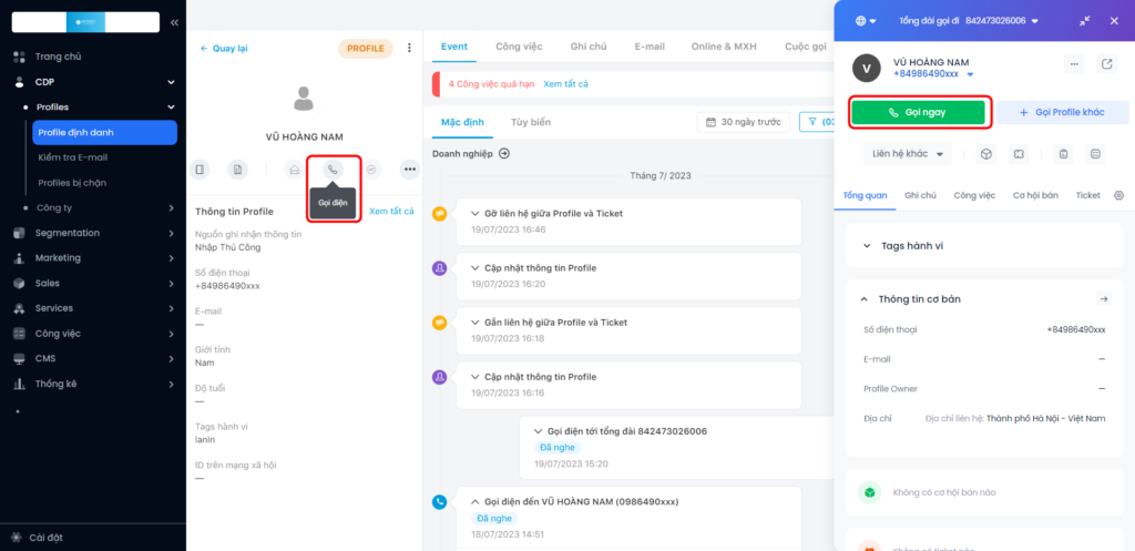 Bước 3: Sau khi tìm kiếm khách hàng, chọn khách hàng cần liên hệ. bấm chọn icon gọi điện để thực hiện cuộc gọi (Hình 3). Hoặc bấm trực tiếp vào khách hàng, bấm Gọi ngay hoặc lựa chọn Gọi Profile khác (Hình 4).