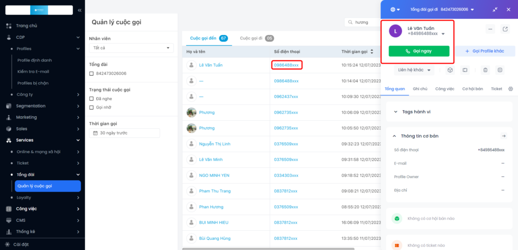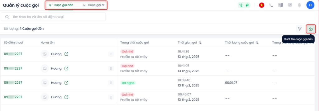 V. Các tính năng trên trang Quản lý cuộc gọi: