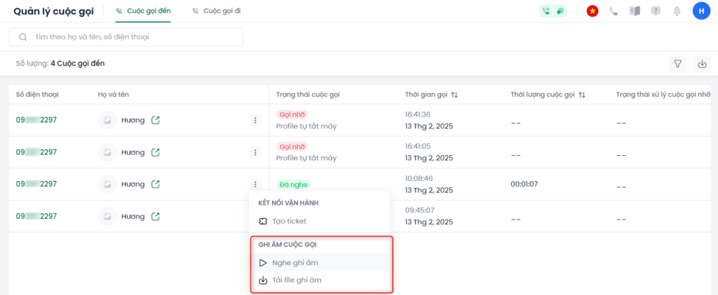 Bấm vào dấu 3 chấm phía sau cuộc gọi có trạng thái Đã nghe Chọn Nghe ghi âm hiển thị cửa sổ popup để nghe đoạn hội thoại. Hoặc Tải file ghi âm để tải trực tiếp file về máy.