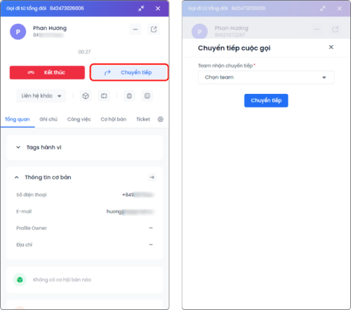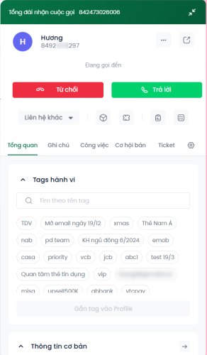 IV. Các tính năng trên cửa sổ Popup cuộc gọi: