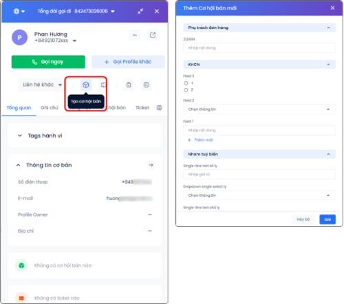 Trỏ chuột vào icon Tạo cơ hội bán → hiển thị cửa sổ popup để thêm cơ hội bán mới → điền các thông tin và bấm Lưu.