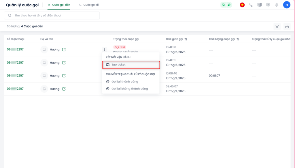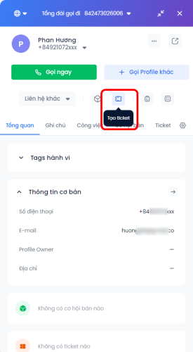 1. Tạo ticket trên Quản lý cuộc gọi: