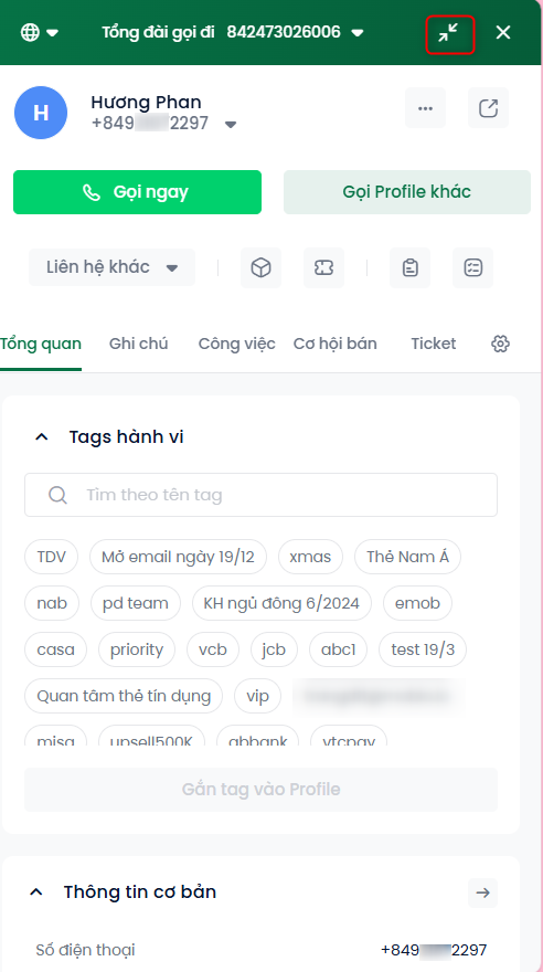 Khi bạn vừa phải gọi điện cho khách hàng, vừa phải thực hiện các tác vụ khác trên giao diện Mobio, bạn có thể thu nhỏ Pop-up để tiện thao tác.