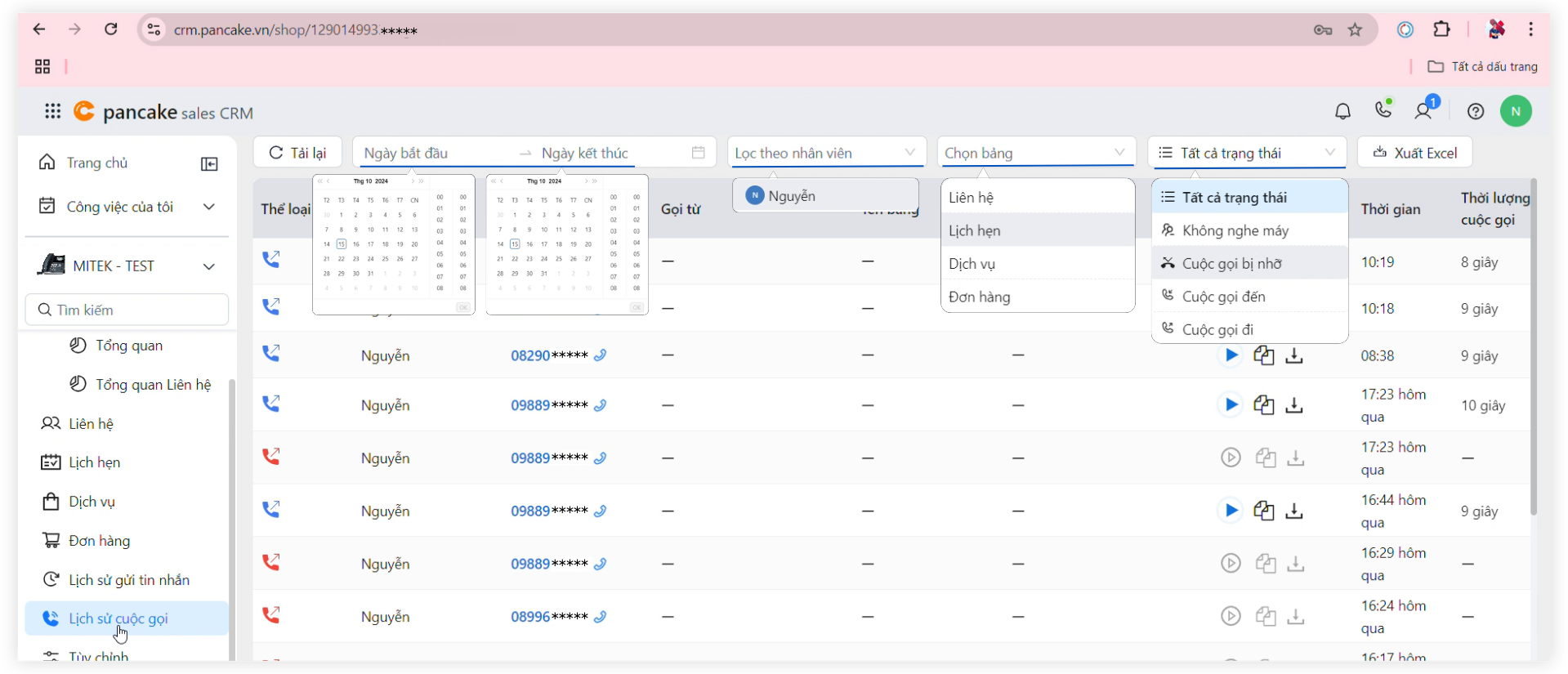 Hiển thị nhật ký cuộc gọi, lịch sử tương tác với khách hàng trên hệ thống Pancake CRM