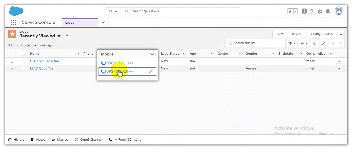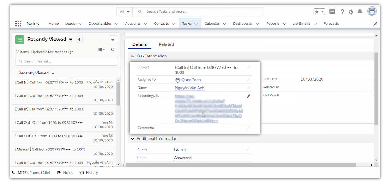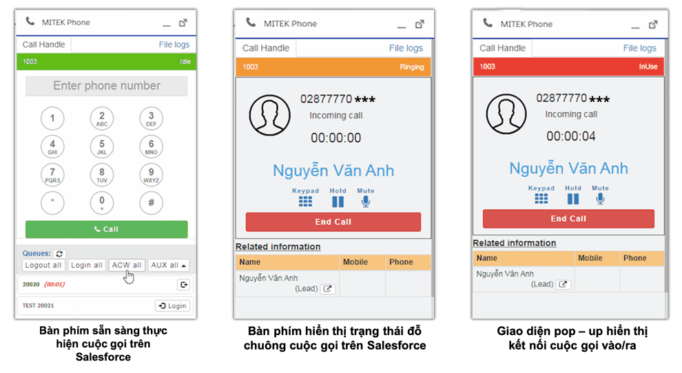 Các giao diện MITEK Phone được hiển thị trên Salesforce CRM