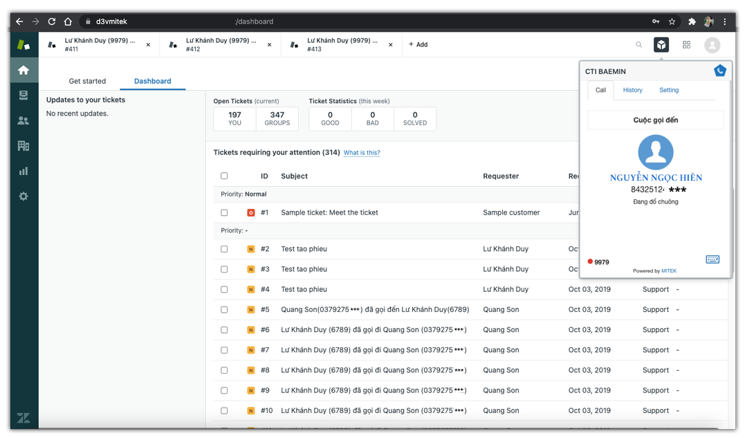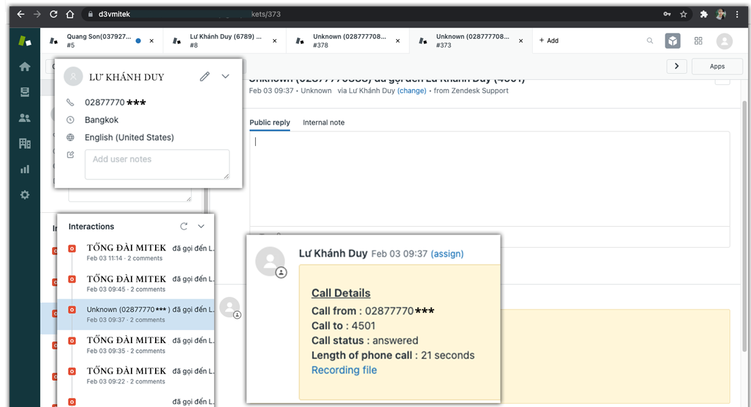 1. Đầy đủ giao diện hỗ trợ xử lý cuộc gọi trên Zendesk: