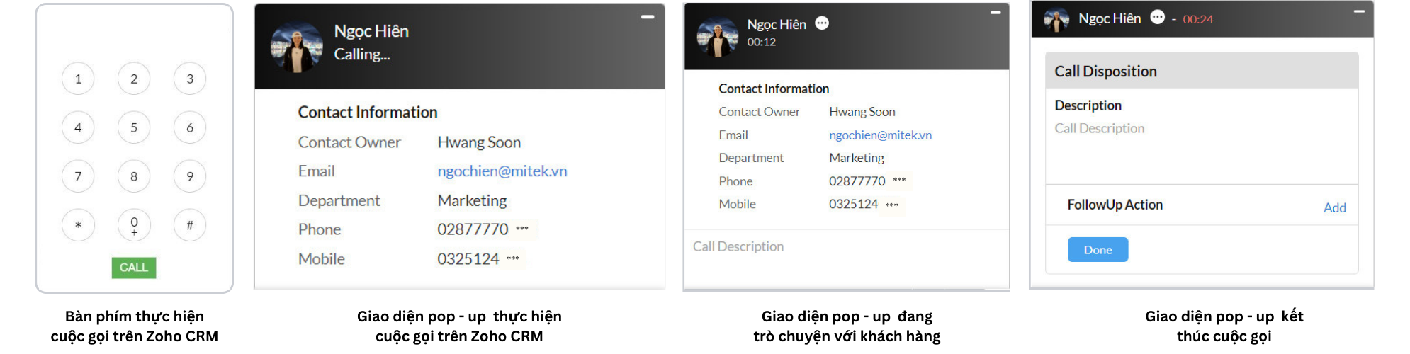 Các giao diện pop-up được tích hợp trên màn hình Zoho CRM, hỗ trợ Agent thực hiện các thao tác tiếp nhận và xử lý cuộc gọi với Khách hàng