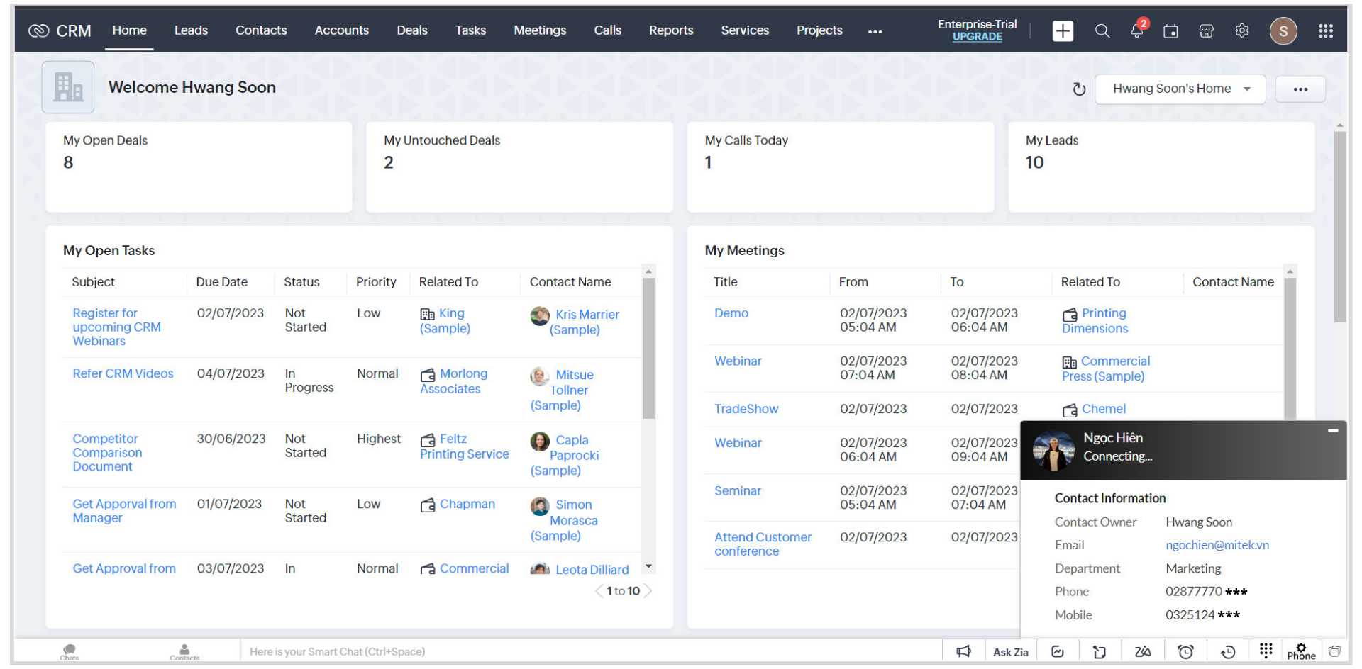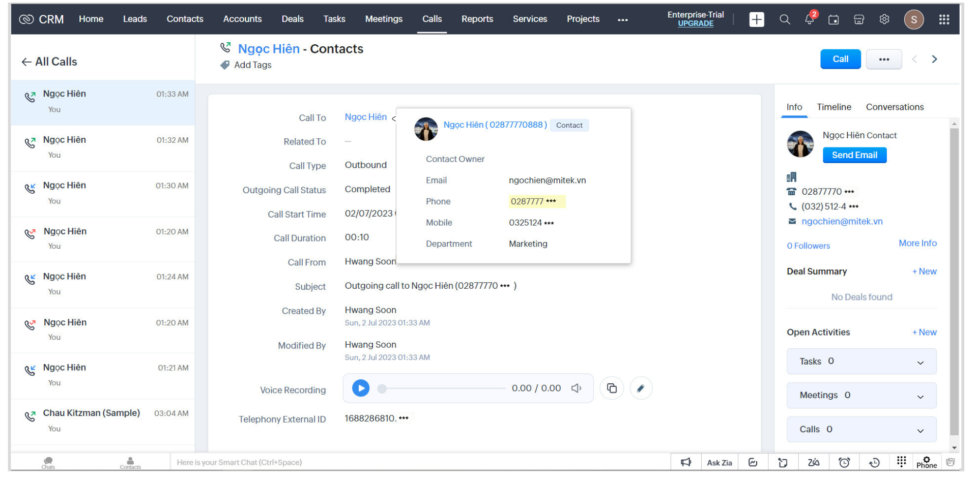 2. Tự động mở Pop-up và hiển thị đầy đủ thông tin khách hàng trên màn hình Zoho CRM khi nhân viên thực tiếp nhận và xử lý cuộc gọi:
