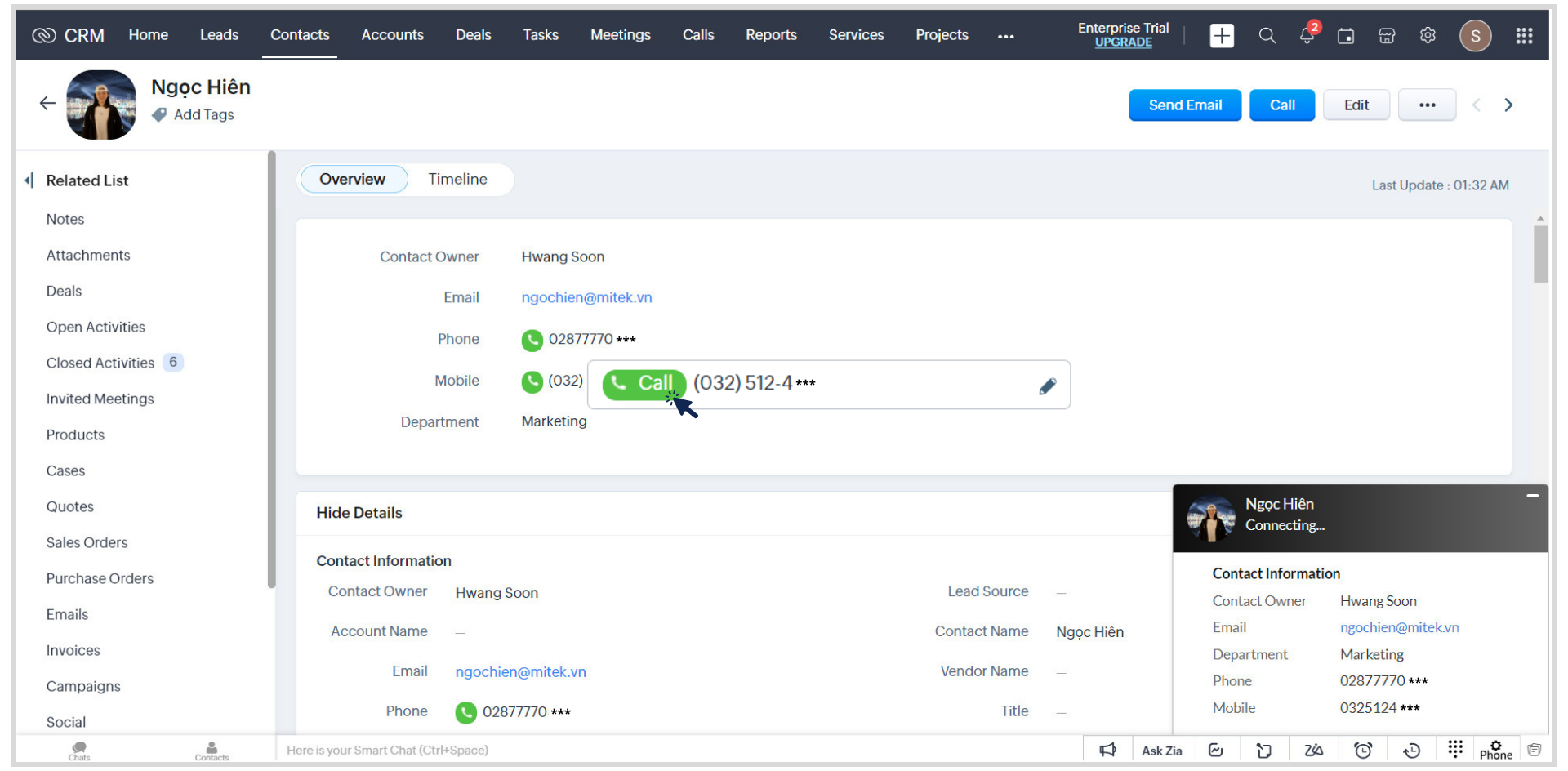 3. Thực hiện cuộc gọi nhanh chóng trong Zoho CRM, chỉ với thao tác Click vào biểu tượng gọi điện là đã có thể bắt đầu cuộc gọi: