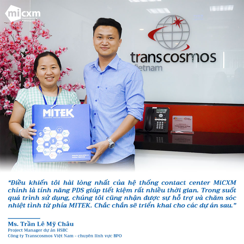 Bên cạnh đó, để triển khai trọn gói một hệ thống Contact Center rất cần sự phối hợp ăn ý và nhanh chóng về kĩ thuật giữa hai bộ phận. Theo đánh giá của chị Trần Lê Mỹ Châu - Project Manager dự án HSBC - Transcosmos Việt Nam cho biết: “Chuyên viên kỹ thuật của MITEK vô cùng nhiệt tình, luôn có mặt khi tôi cần và sẵn sàng hỗ trợ hết sức để đáp ứng các nhu cầu tôi đặt ra. Ví dụ như, khi tôi yêu cầu viết thêm báo cáo thì đều đáp ứng được. Vì vậy, tôi không cần phải lo lắng về việc thiếu hụt các báo cáo chi tiết cho phía đối tác HSBC.