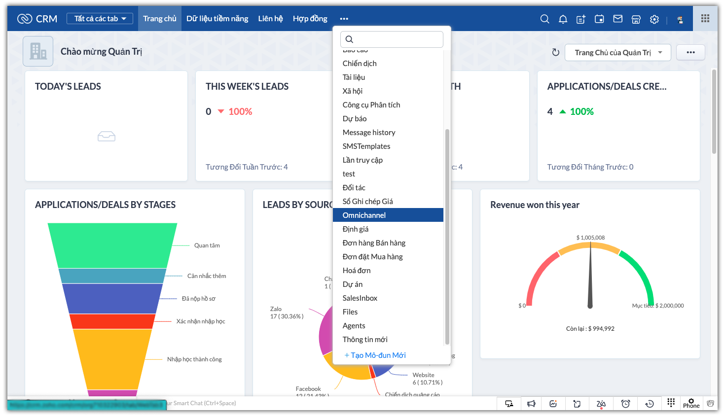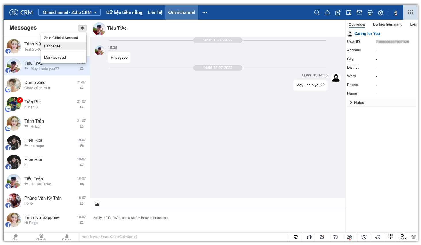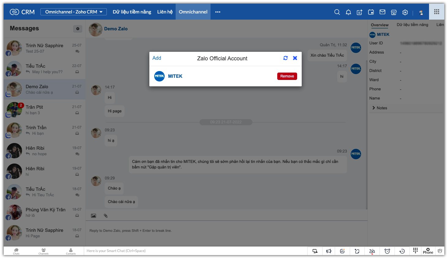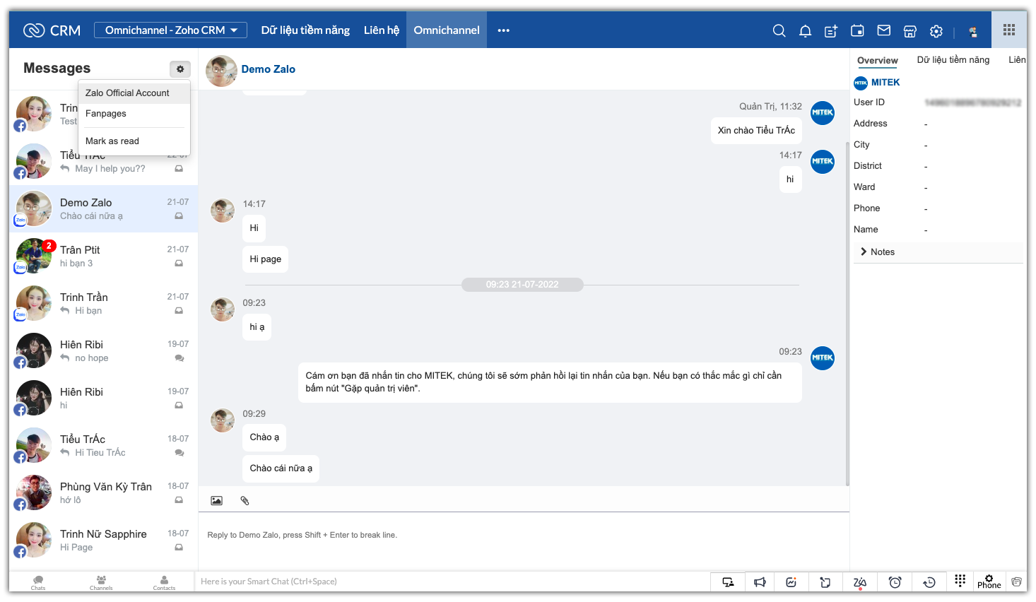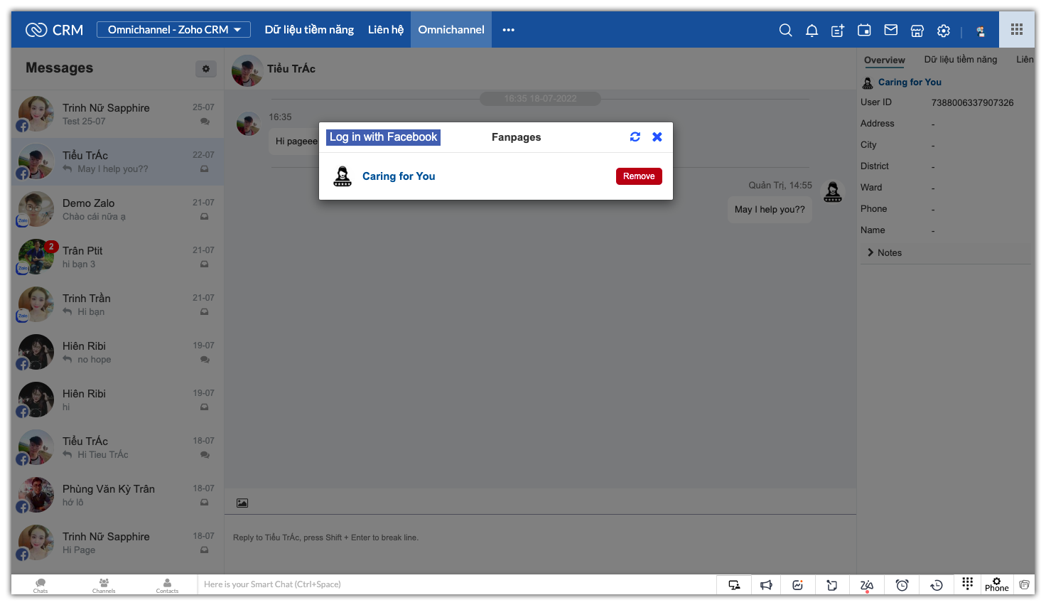 Facebook, Zalo OA vào Zoho CRM
