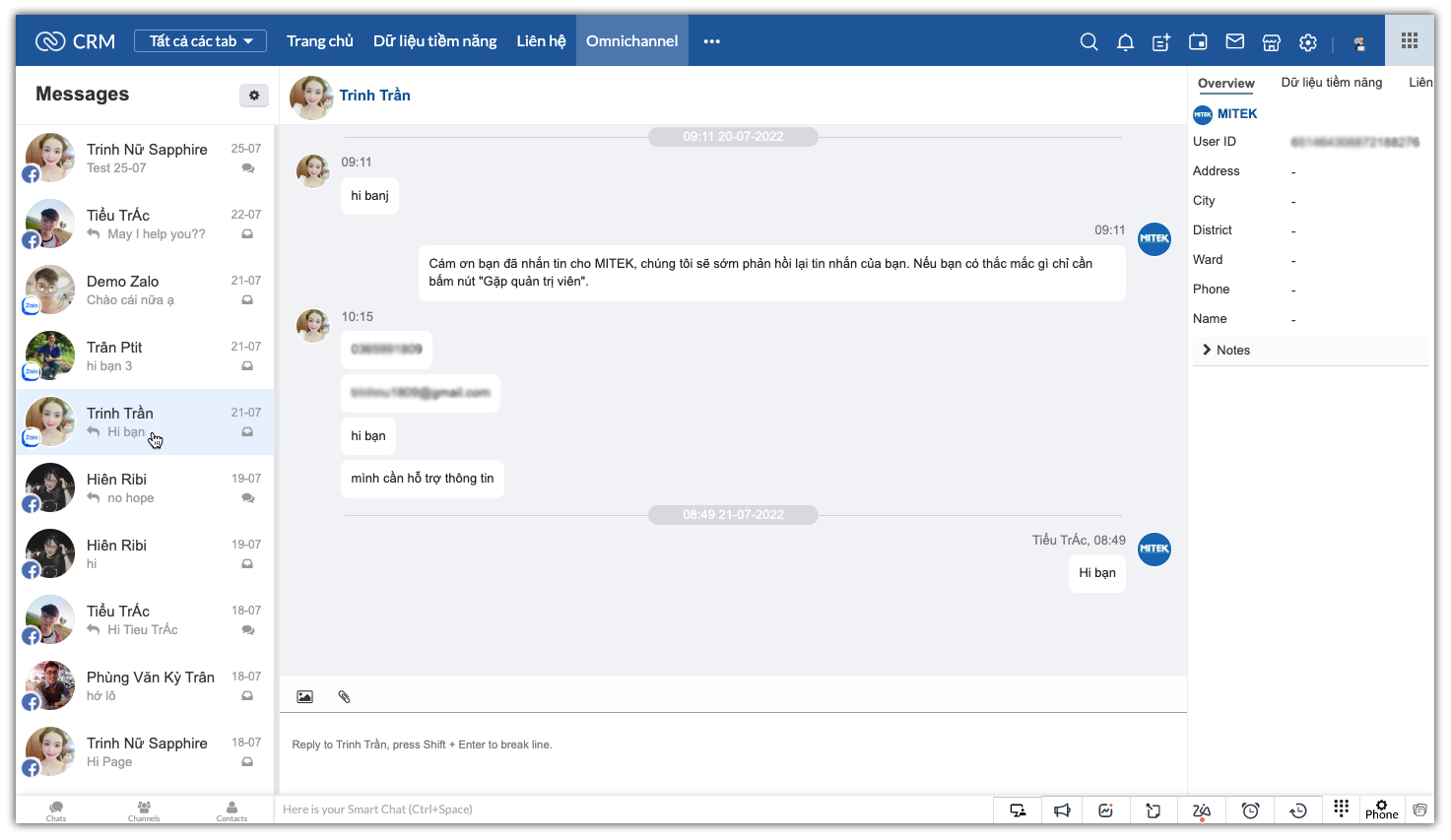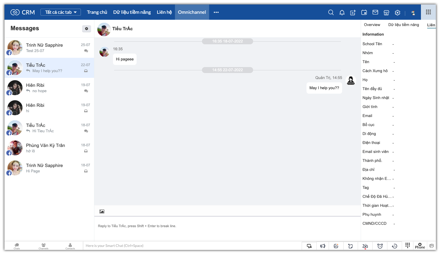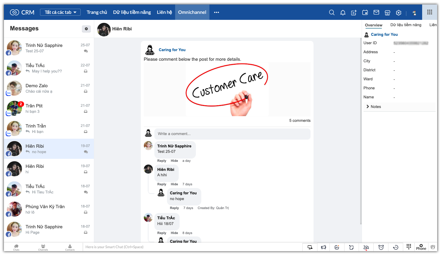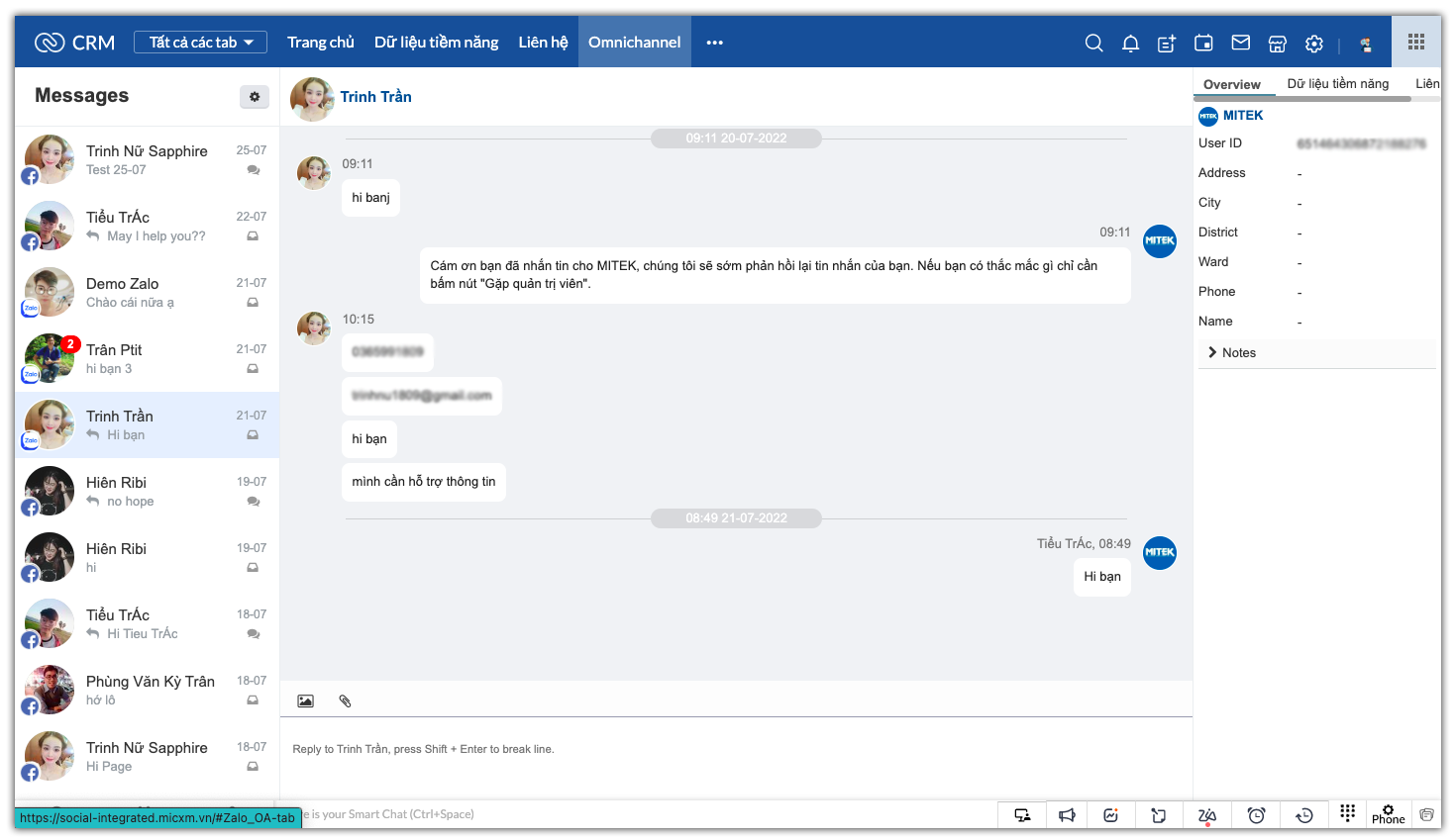 1. Cửa sổ OmniChannel quản lý kênh Facebook, Zalo OA: