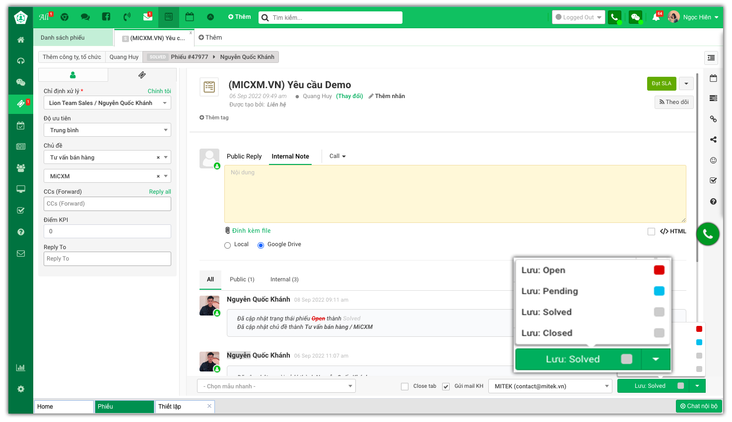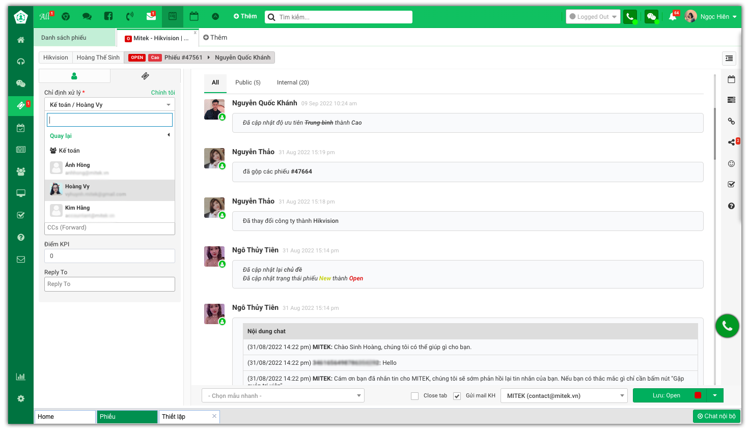 Khi phối hợp làm việc trên 1 Ticket với các thành viên trong nhóm, phiếu ghi sẽ hiển thị đầy đủ thông tin, nhu cầu của Khách hàng, giúp đội nhóm của bạn làm việc một cách hiệu quả.