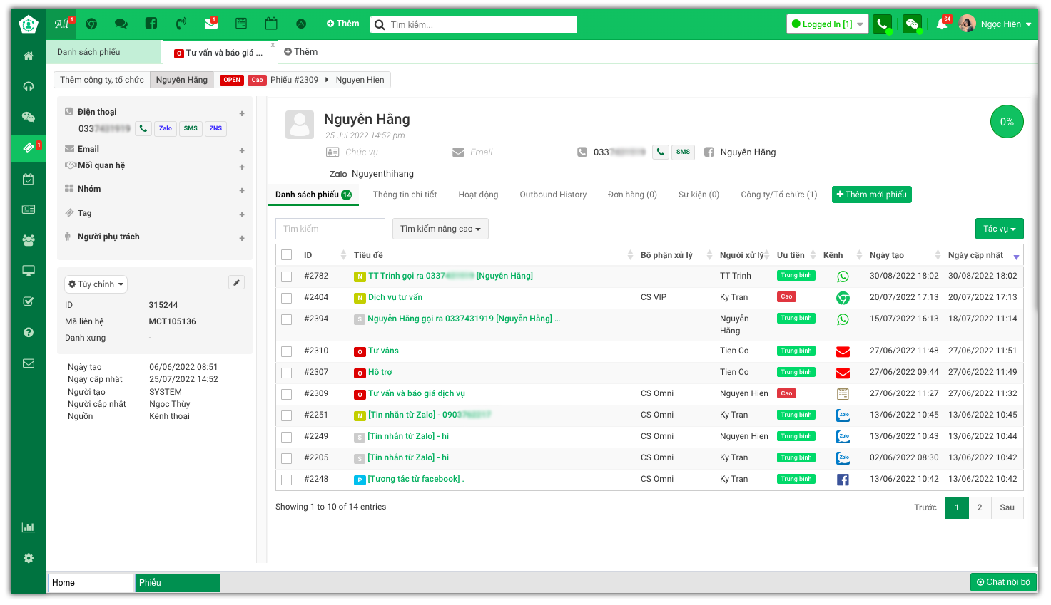 Khi cần hỗ trợ, tư vấn, Khách hàng sẽ tìm đến các kênh Chat của Doanh nghiệp để liên hệ như Facebook, Zalo OA, Live chat,… Khi Khách hàng liên hệ vào kênh trò chuyện, các kênh trò chuyện sẽ được chuyển đổi thành một phiếu và phân bổ phiếu đó đến đúng nhân viên cần gặp.