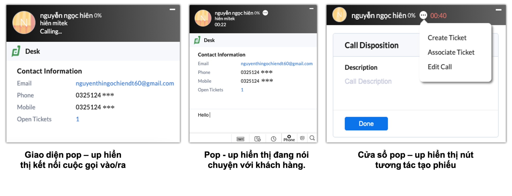 Hiển thị thông tin khách hàng ngay khi có cuộc gọi vào/ ra: Email, số điện thoại, trạng thái phiếu,...Pop - up hiển thị đang hội thoại giữa Agent với khách hàng: