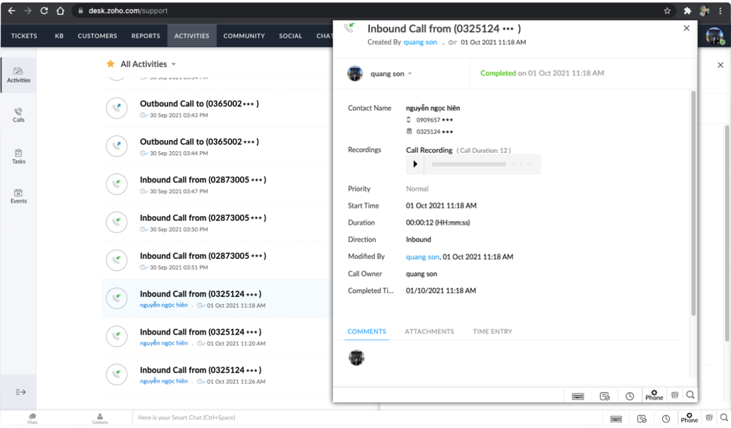 Hiển thị người tạo, thời gian đã tạo liên hệ khách hàng.Điện thoại viên chỉ cần thao tác Click to call vào số diện thoại khách hàng cần gọi trên Zoho Desk