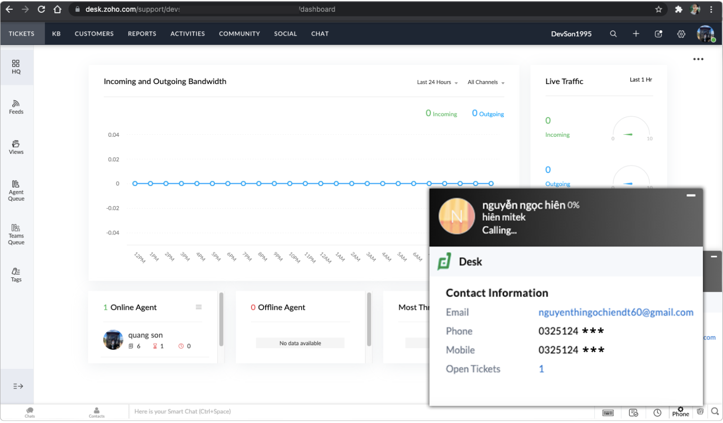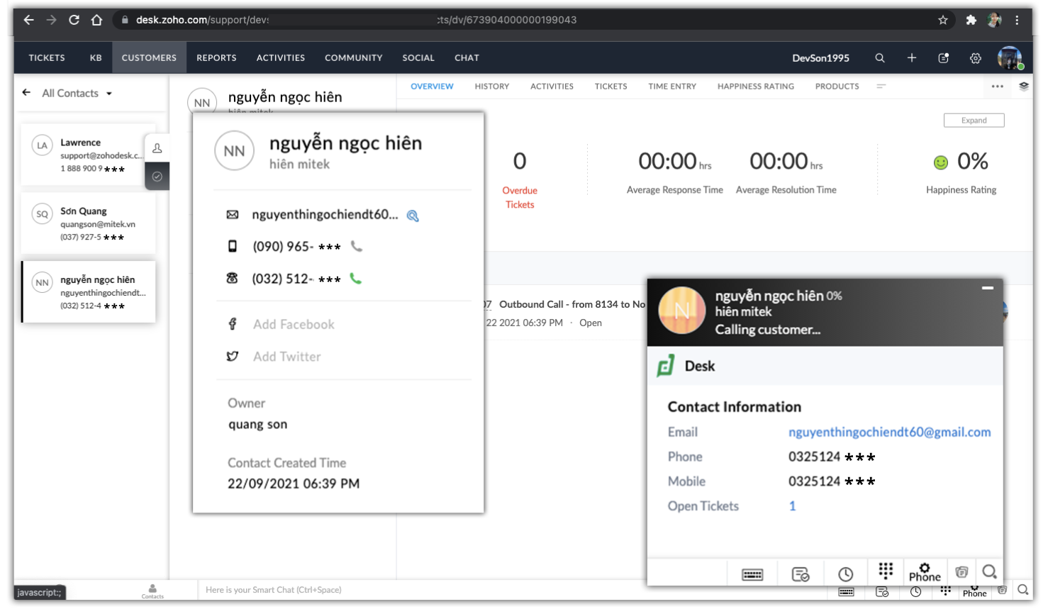 Hiển thị thông tin khách hàng ngay khi có cuộc gọi vào/ ra: Email, số điện thoại, trạng thái phiếu,...Hiển thị đầy đủ thông tin khách hàng khi Agent tiếp nhận và xử lý cuộc gọi trên Zoho Desk