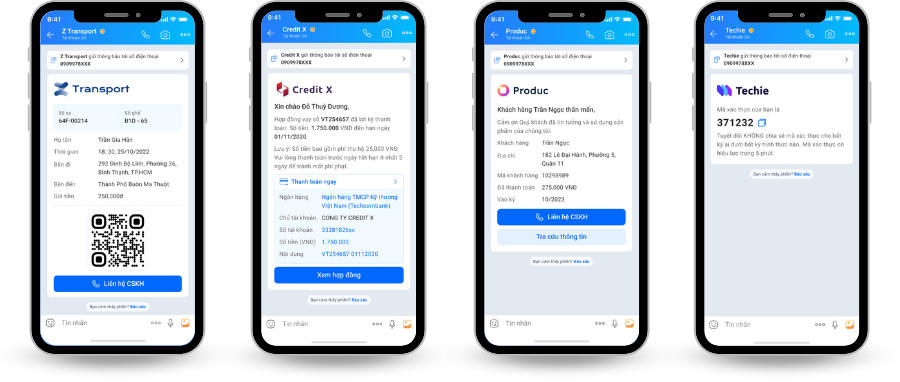 ZNS giao dịch thường liên quan đến các thông báo về trạng thái giao dịch tài chính, như: