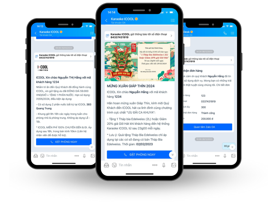 Là dịch vụ gửi tin nhắn Zalo tới người sử dụng các thông tin, thông báo được cá nhân hóa. Ứng dụng gửi tin nhắn Chăm sóc khách hàng sẽ bao gồm: