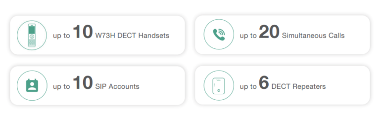 Hệ thống W73P có thể hỗ trợ 10 thiết bị cầm tay, 10 tài khoản SIP và 20 cuộc gọi đồng thời (2 cuộc gọi trên mỗi thiết bị cầm tay).